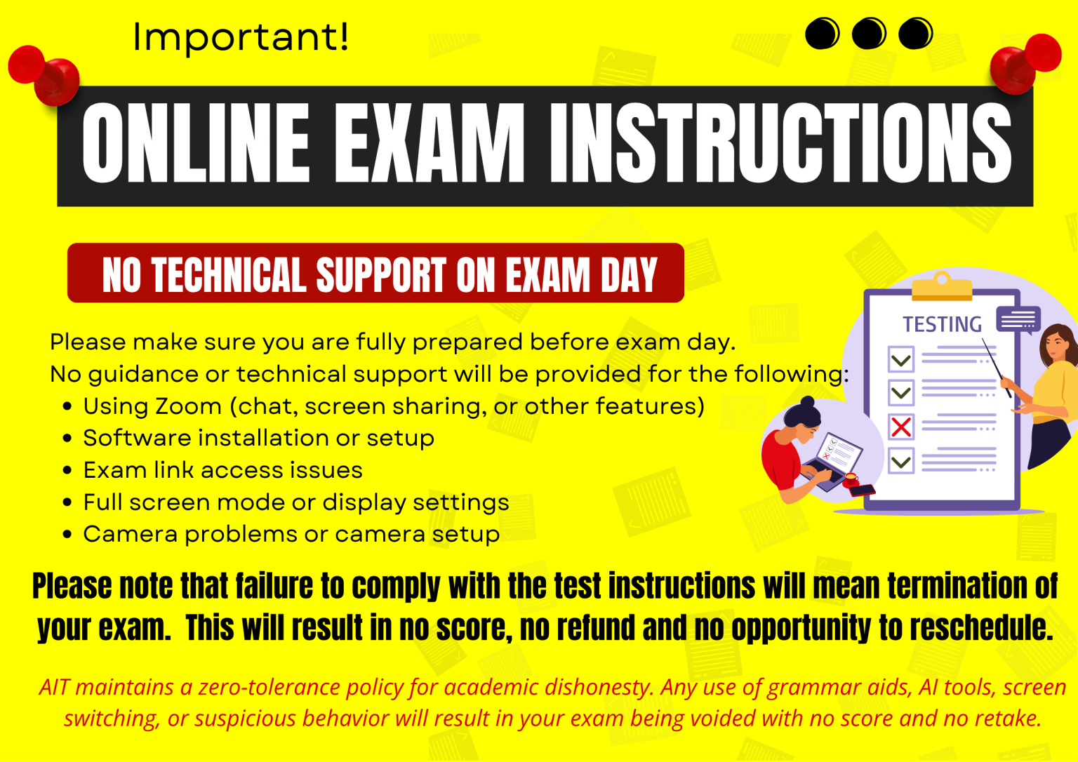 If you encounter issues accessing the trial exam, contact LCtesting@ait.asia at least 3 days before your exam. Technical support will not be available after this period.