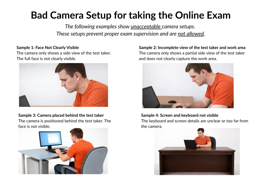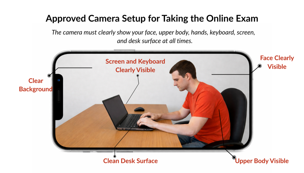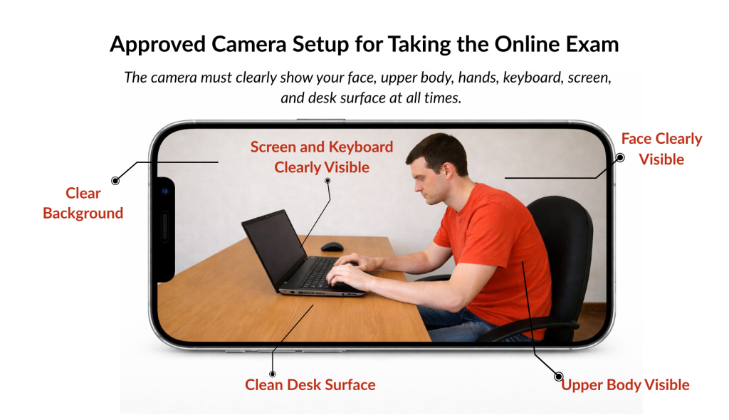 An approved camera setup is mandatory for proper exam supervision. Failure to comply will result in immediate exam termination, and no score will be recorded.